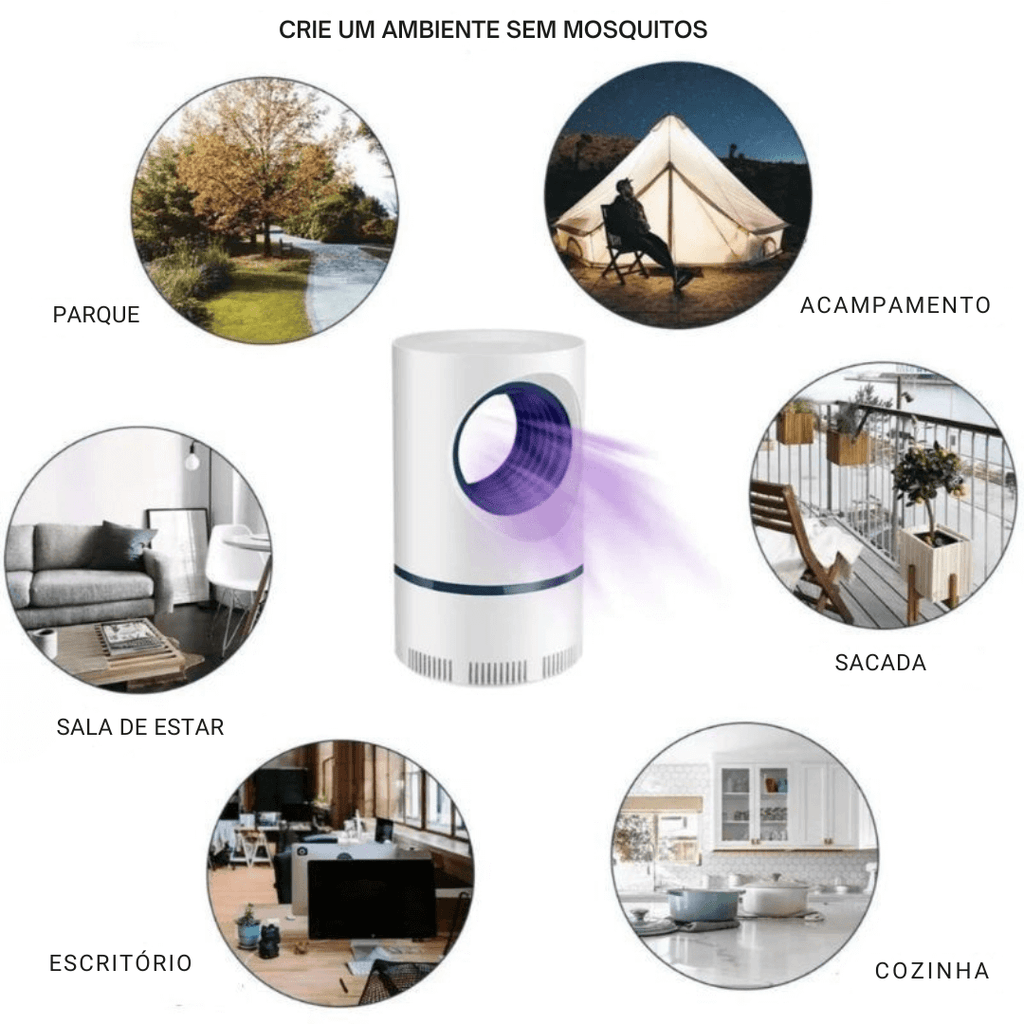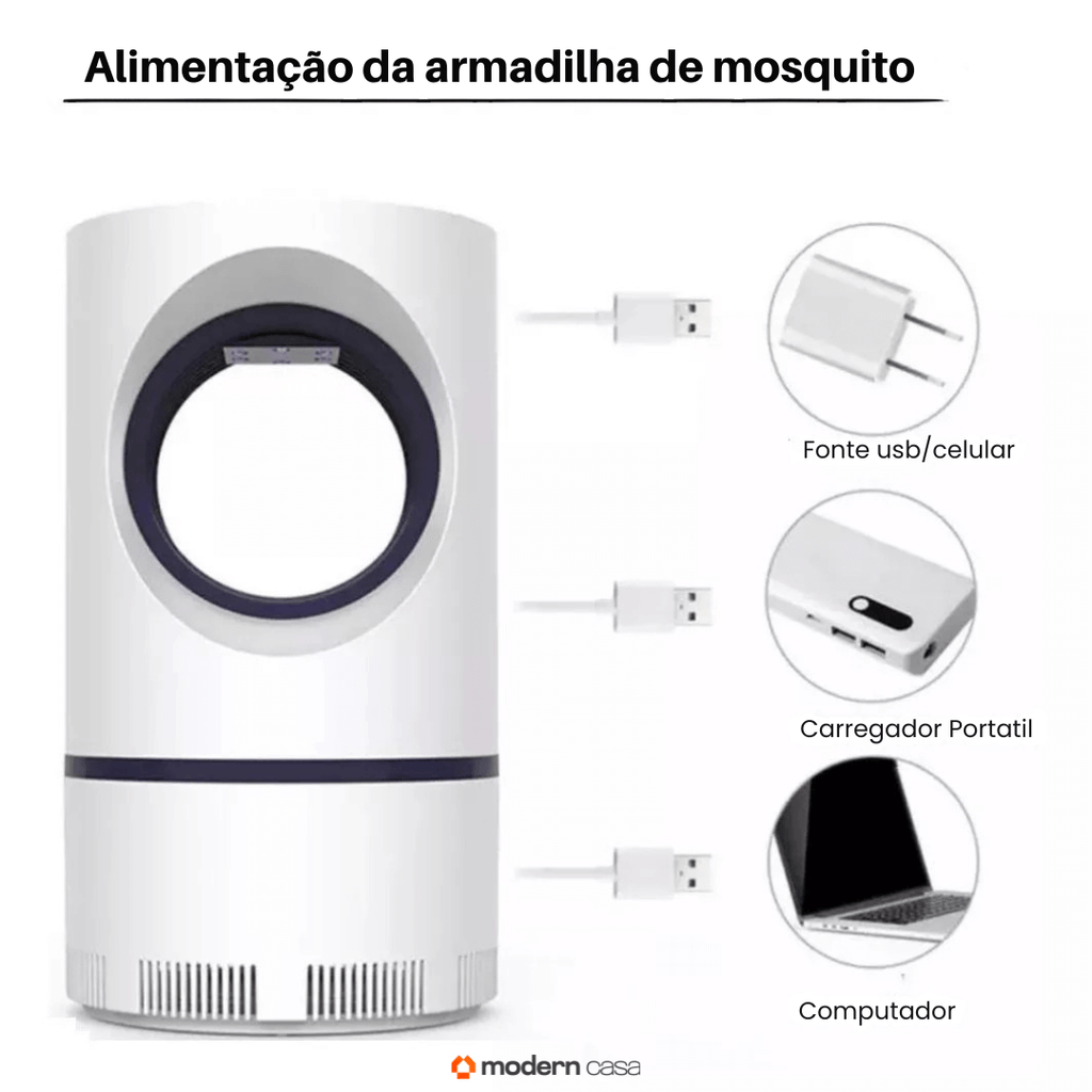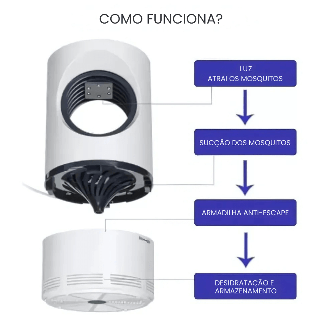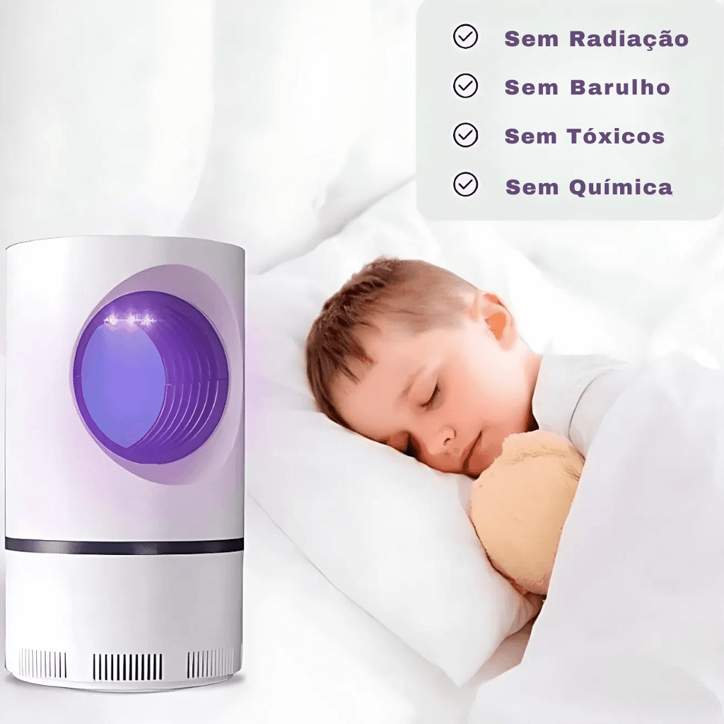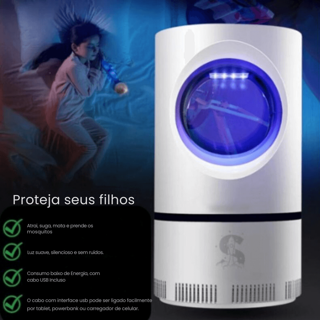 Luz UV de Alta Eficiência (365 nm): Atrai os mosquitos com precisão graças aos 4 LEDs UV — ideal para ambientes escuros como quartos e salas.