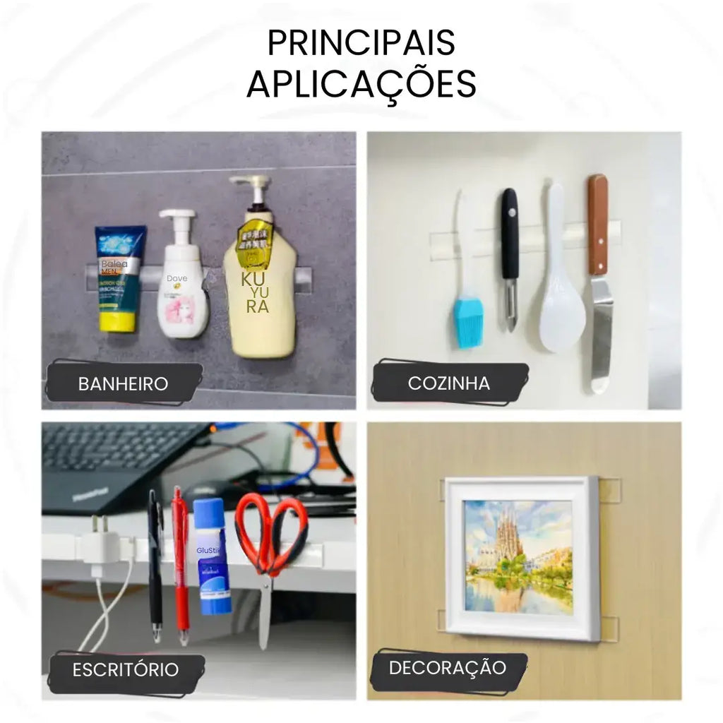 Cola firme e segura Feita com tecnologia em gel nano adesivo, fixa com alta resistência quadros, suportes, tapetes, utensílios e mais.
