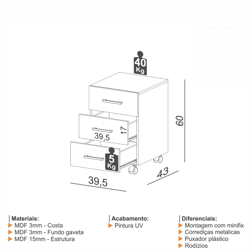 - 100% MDF de excelente qualidade - Pintura com 6 camadas de proteção - Gaveteiro 3 gavetas - Gaveteiro Montagem com Miniflix - Gaveteiro com Corrediças metálicas - Gaveteiro com Puxador Plástico - Gaveteiro com Rodízios