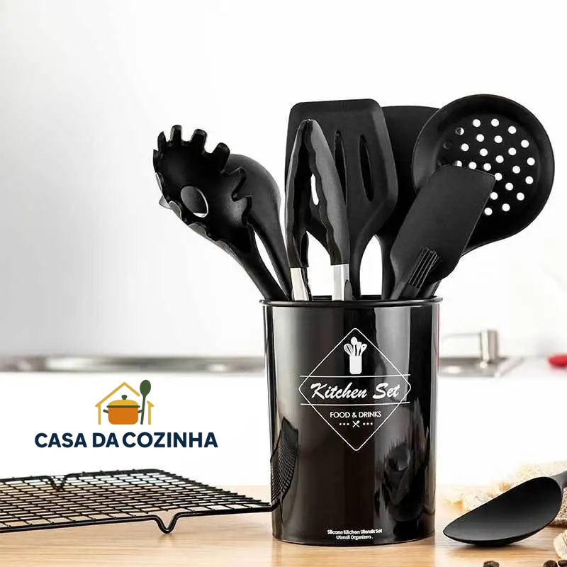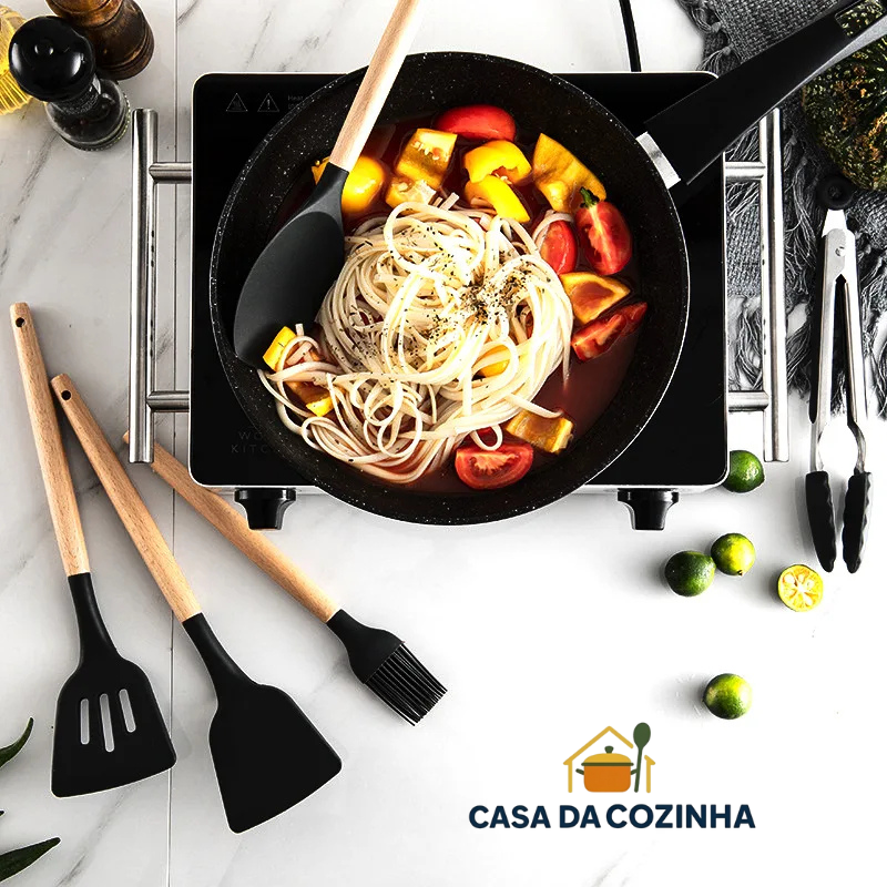 🖤 Kit Utensílios de Cozinha Premium – Silicone e Madeira