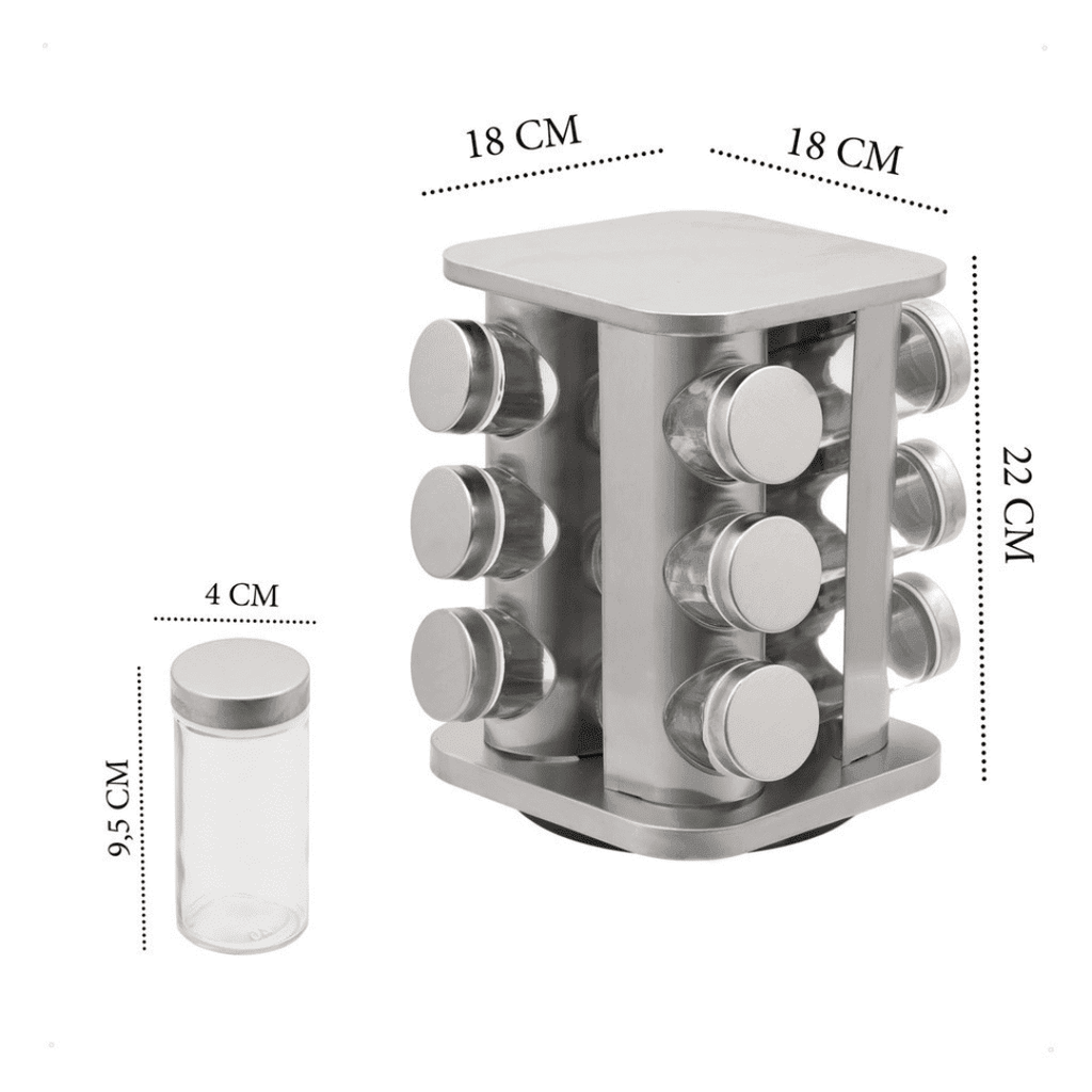 - Economia de espaço A estrutura compacta e otimizada permite que você armazene 12 potes em um único local, sem ocupar muito espaço no balcão.