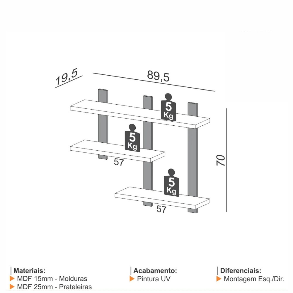 Características: - 100% MDF - Design moderno - Resistência e durabilidade - Prateleiras MDF 25mm - Suporta até 15Kg - Acabamento resistente em pintura UV